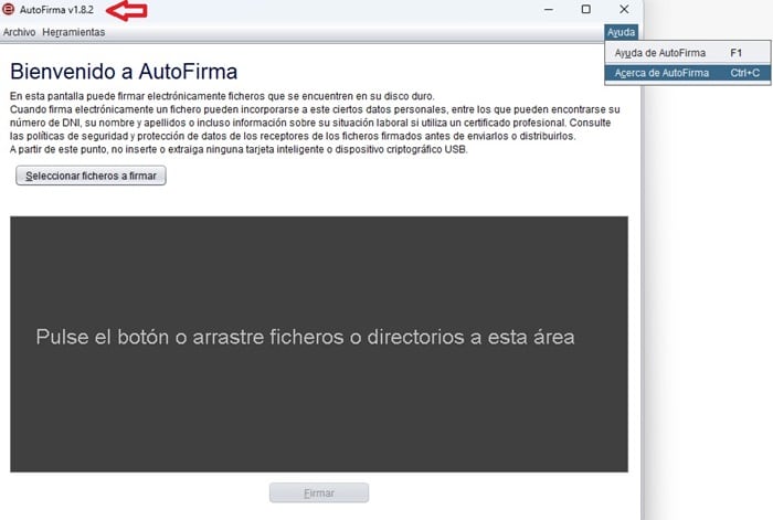 Abrimos AutoFirma y arriba a la derecha hacemos clic en Ayuda => Acerca de AutoFirma